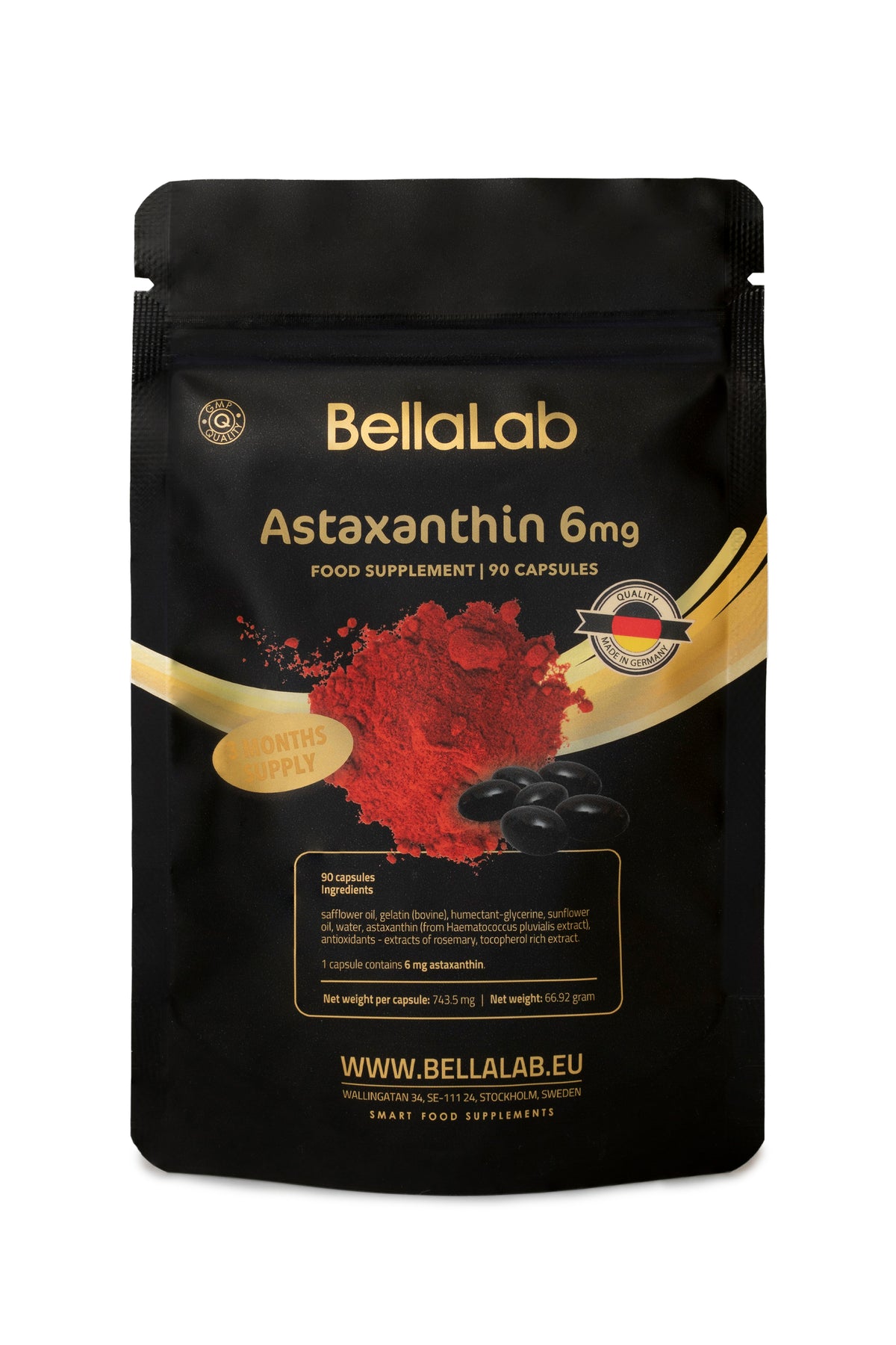 Saflooriõli, želatiin (kaladest), niiskusesäilitaja glütserool, päevalilleõli, vesi, astaksantiin (vetikatest (Haematococcus pluvialis)), antioksüdant rosmariiniekstraktid, antioksüdant tokoferooli kontsentreeritud ekstrakt.